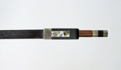 Die Bewicklung aus abwechselnd schwarzem und durchsichtigen Fischbein wird von einem schwarzen Daumenleder beendet. Das dreitieilige Beinchen mit mittig schwarzem Ebenholz und Perlmuttauge an der Stirnseite ist schon Tradition. Den Ebenholzfrosch verschönert ein Pariserauge und der Schacht wird von einem mit Neusilber gefassten, bunten Perlmuttschieber gedeckt.