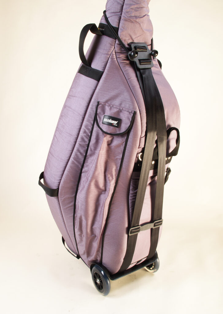 Der Bass Buggie wird am Stachel eingehängt. Der Wagenschlitten liegt an der Zarge des Basses an. Die breiten Riemen werden an der Seite des Basses hochgeführt und oben mit einem stabilen Gummizug um den Hals eingehängt.